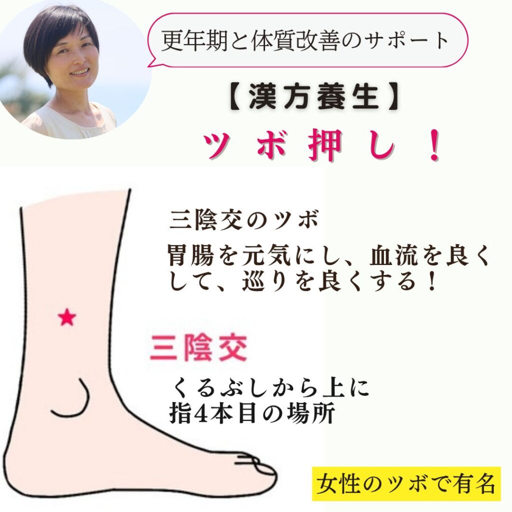 三陰交は座らないと押せないので、私は、湯船に浸かっているときによく押しています。