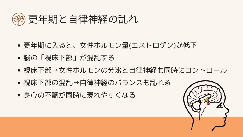 視床下部は、 女性ホルモンの分泌量を調整すると同時に、 自律神経のバランスもコントロールしている場所です。